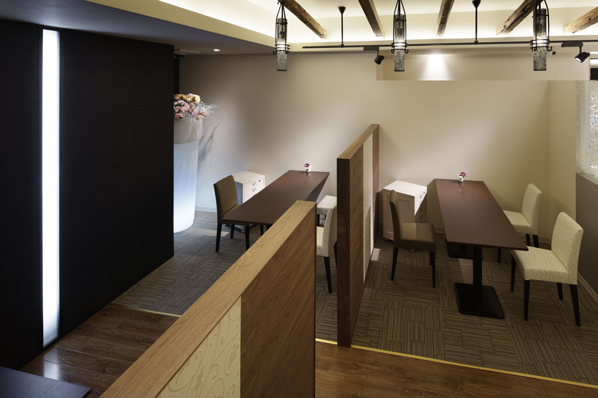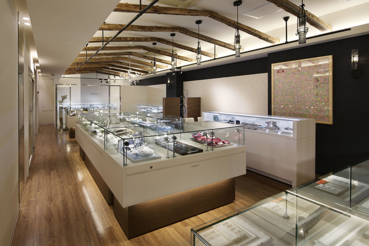 改修のコンセプトは、「ウエディング・セレモニーが行われるような空間」。アプローチが長く、一般的に、お客様が入りにくいと言われている2階店舗の改修。長いアプローチの廊下・階段で「バージンロードを歩く様なドキドキ感」を演出した。店舗内は、天井面に古木の母屋を連続して配置し、床はアンティーク調のウッドタイルを使用し、教会のような空間を表現した。 祭壇のイメージで設けた店舗奥の光のスリットの近くには、結婚の意思(購入の意思) を固めるための接客コーナーを設けた。