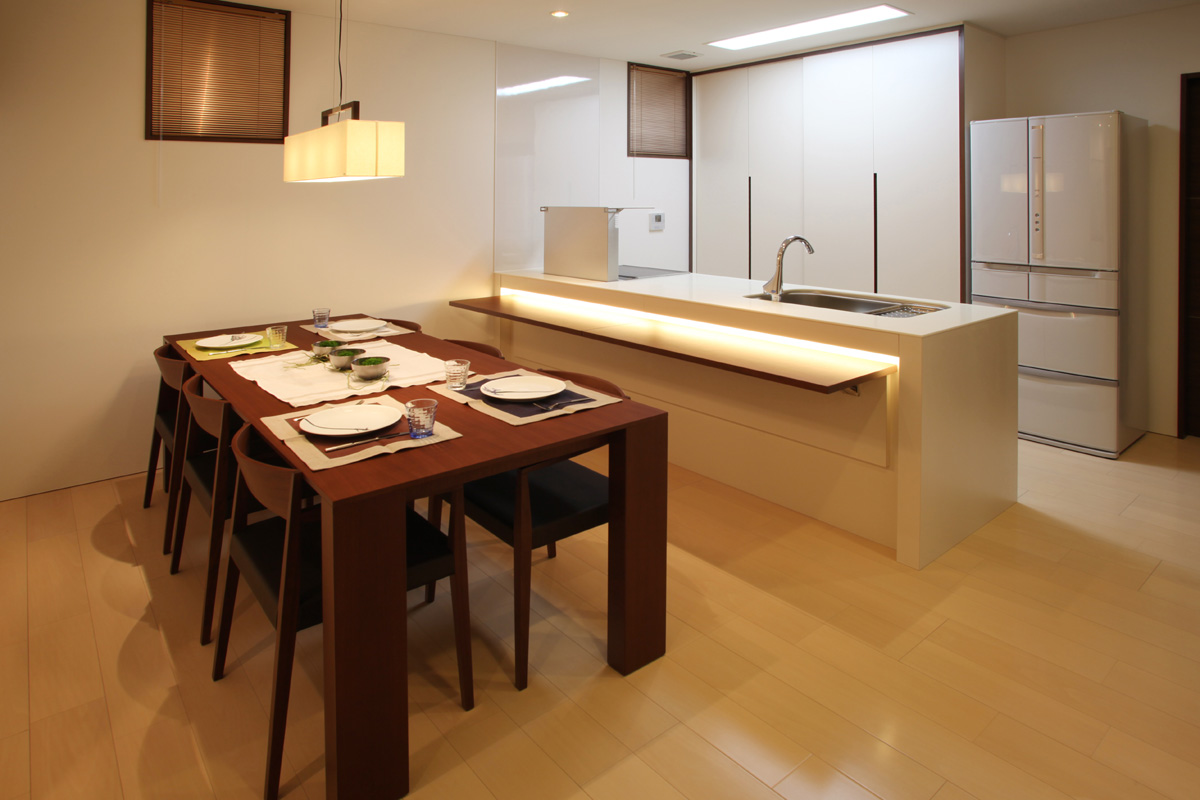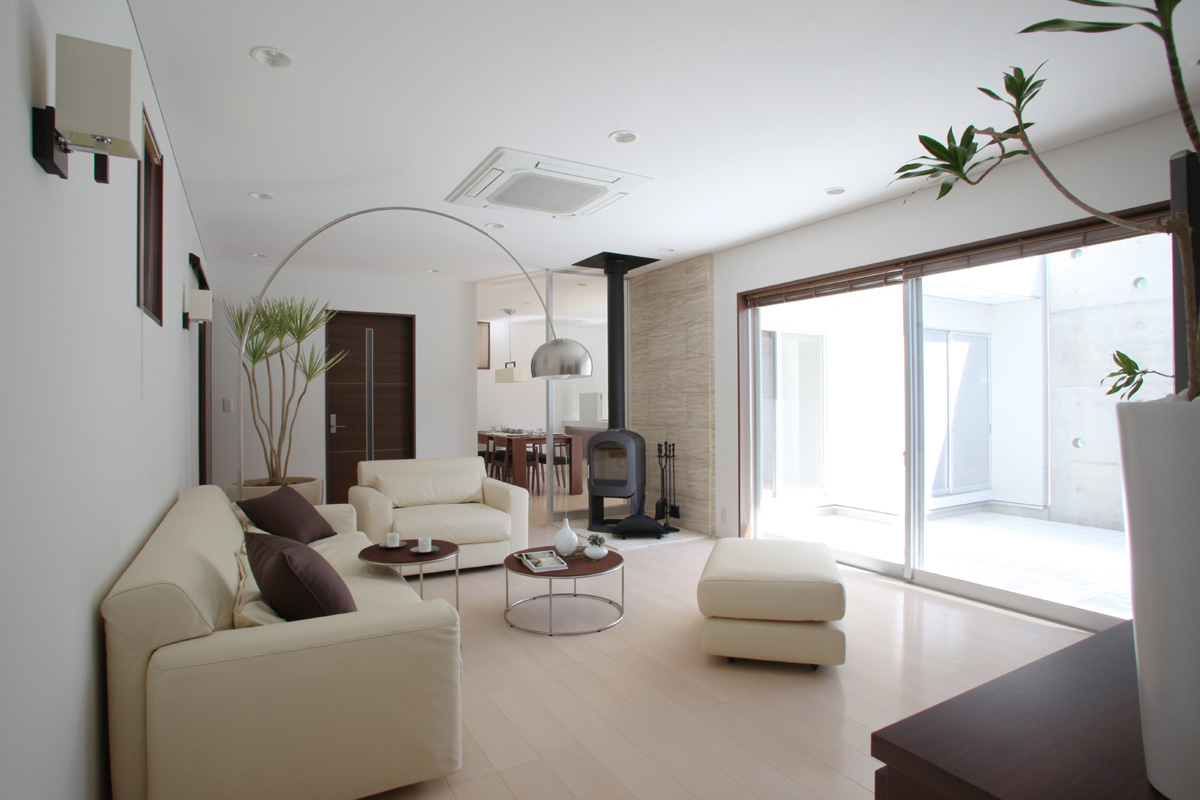 庭に面してL型に建物を配置し、緩やかに気配が感じられる住宅。1階には暖炉を中心としたリビング・ダイニング・キッチンを配置し、2階には寝室・浴室・洗面脱衣室などを配置し、動線的にプライベートとパブリックを分離する空間構成とした。